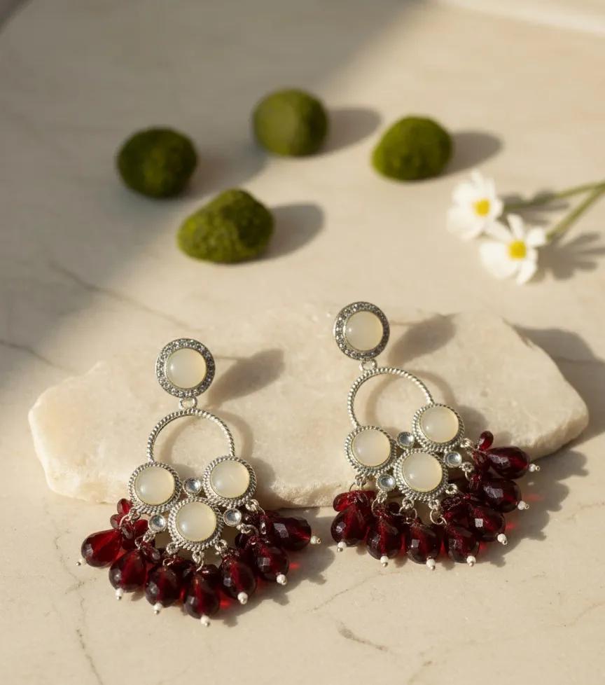 Beautiful oxidised silver jhumka earrings featuring intricate detailing and red beaded drops. Designed with traditional craftsmanship, these earrings add a touch of ethnic elegance to any outfit. Lightweight and comfortable for long wear — perfect for festive occasions, weddings, or casual ethnic looks.